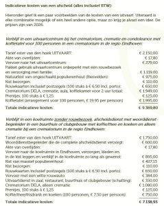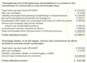 Hieronder beschrijf ik een paar verschillende scenario’s zodat je een beetje een idee krijgt. Uiteraard kan er nog veel meer. Dit is een voorbeeld uit een bestaande offerte voor een crematie. Een begrafenis is iets duurder; afhankelijk van de begraafplaats komt er gemiddeld 2.000 euro bij (exclusief grafsteen).